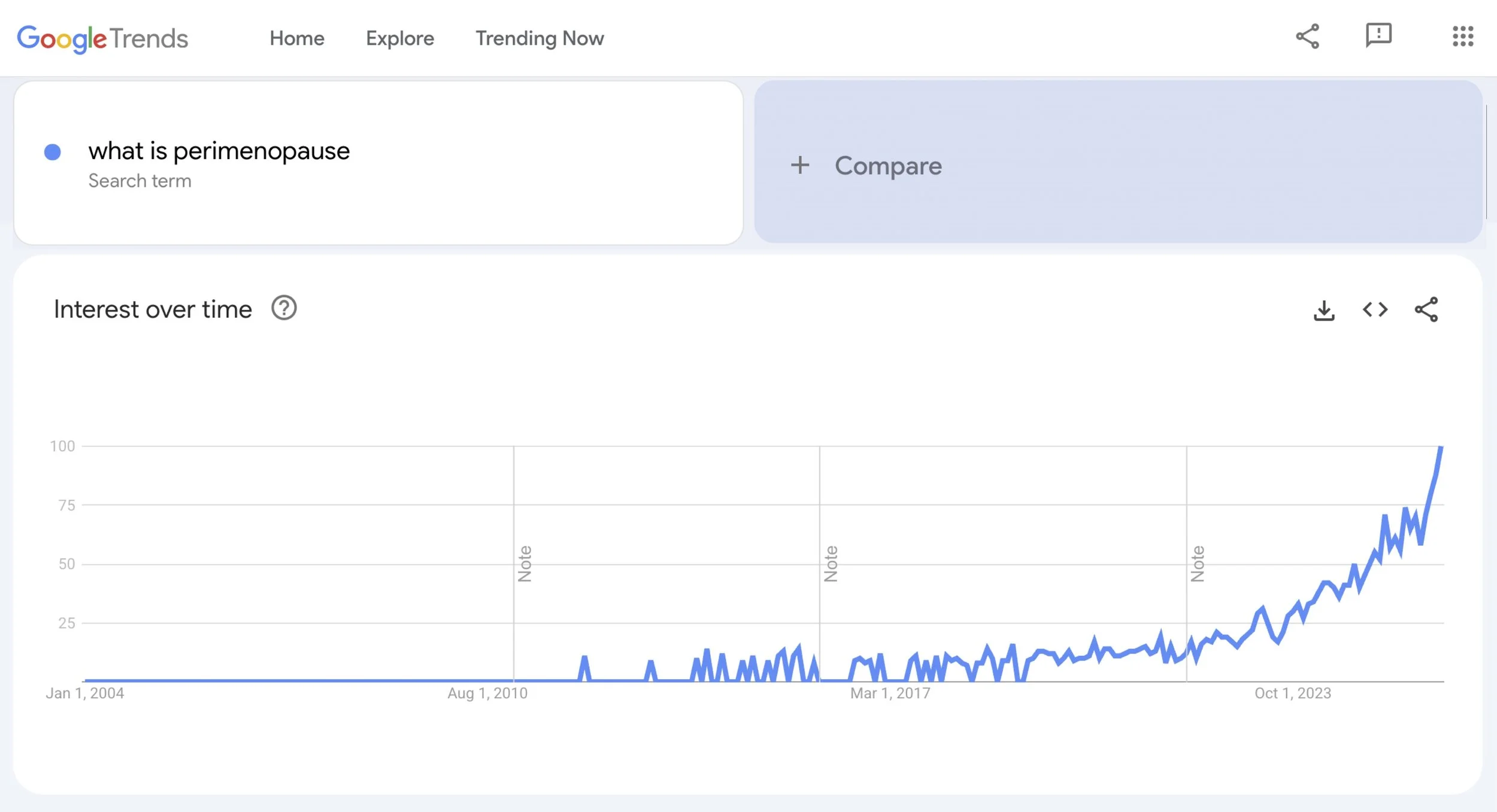 Google Trends Searches for What is Perimenopause since 2004, showing a marked increase since 2022.
